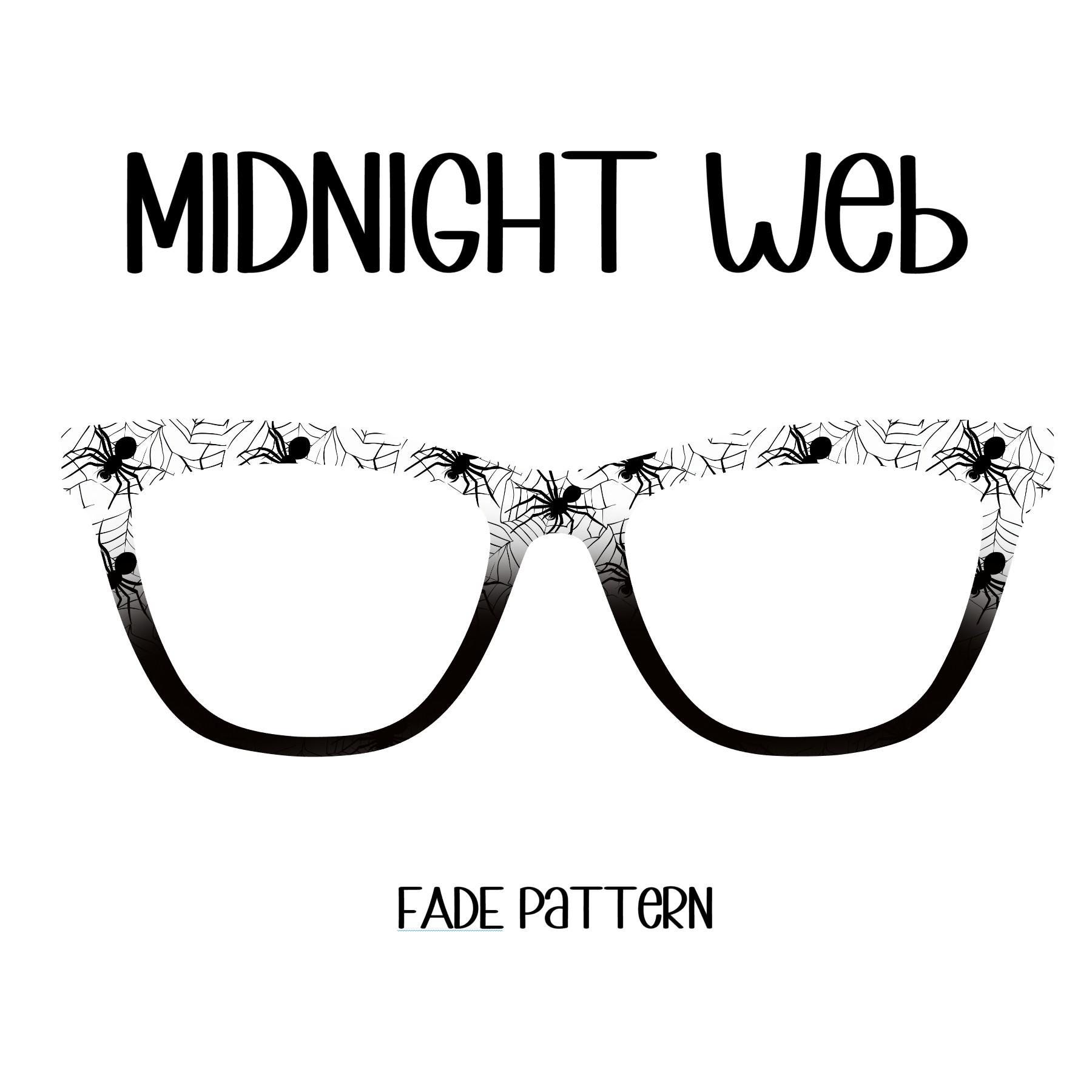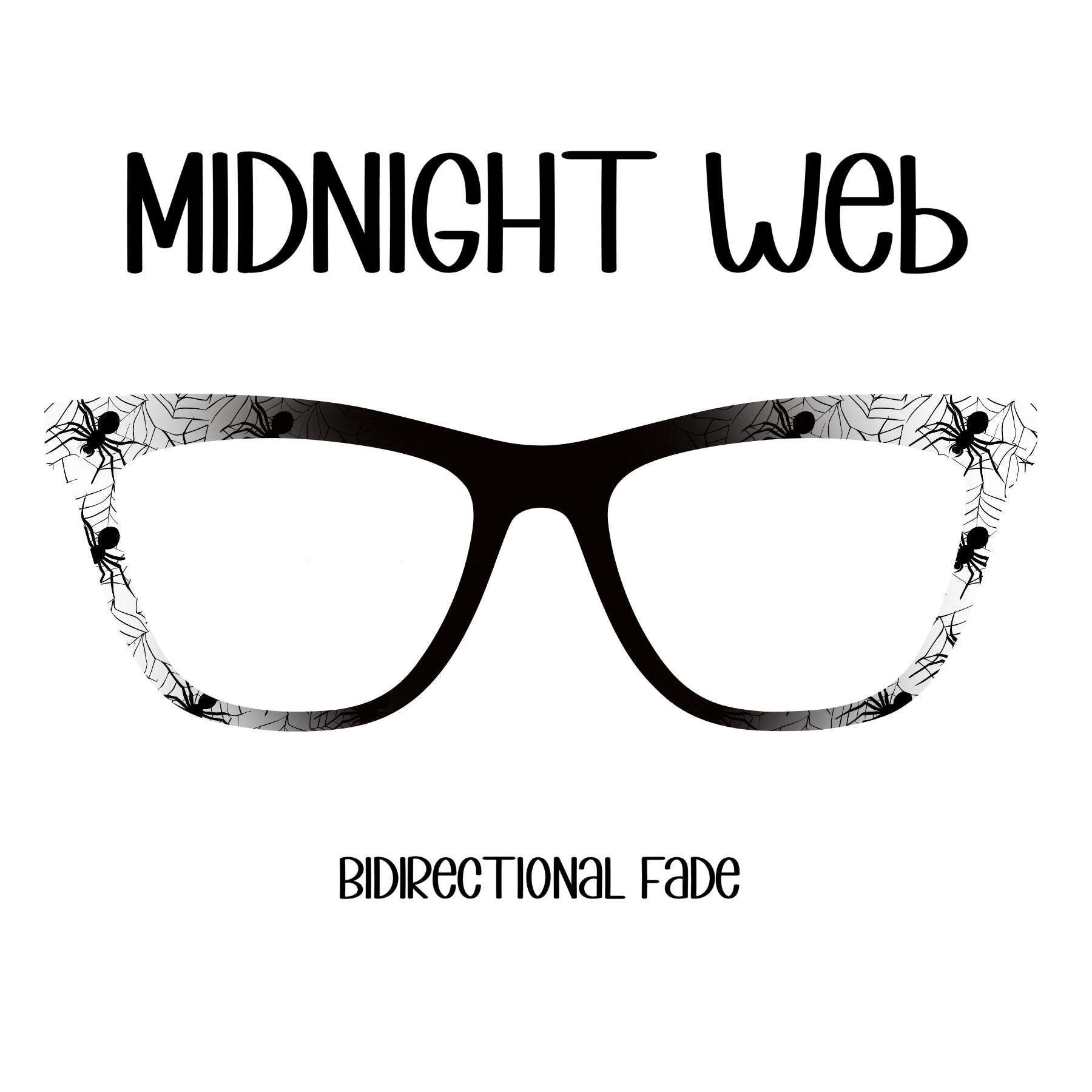 Our Midnight Web eyeglass topper features a sleek black-and-white spider weaving a delicate web, adding a touch of mystery and sophistication to your eyewear.